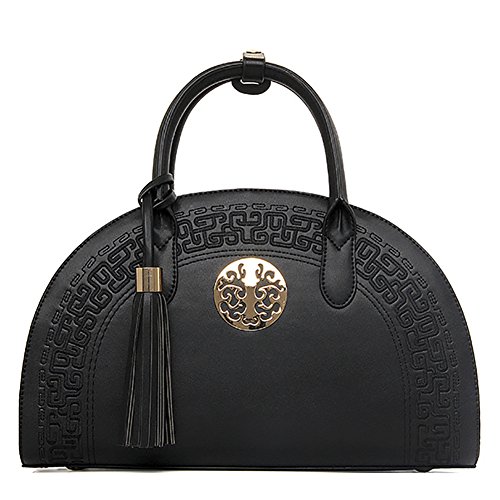 QZUnique Women's Retro Chinese Style Empaistic PU Leather Zipper Shell Tassel Shoulder Top Handle Bag