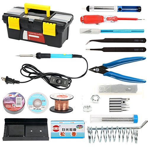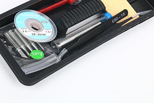 - 【19-in-1 Soldering Iron KIT】 - Soldering iron kit comes with soldering iron(with 1.5m power cable), solder wire, desoldering pump, solder wick, stand with cleaning sponge, 5 multiple soldering tips, 2 anti-static tweezers, rosin (solder paste), copper wire, scissors, screwdrivers(electric pen), insulation tape, knife and a hard carry case to meet all your soldering project needs
