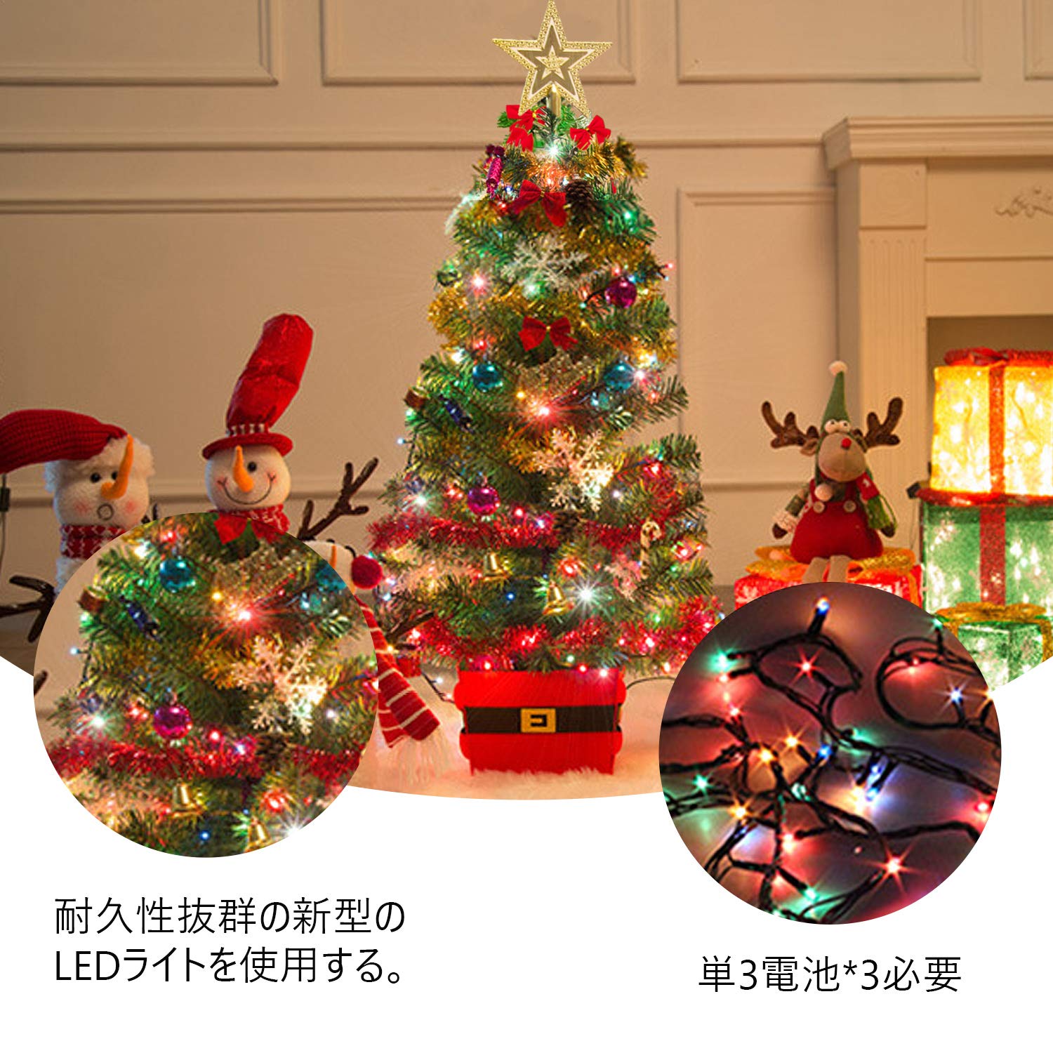 【特徴】付属のLEDライトは電池式だから、場所を選ばずどこでも置けます。キラキラとした可愛らしいデザインが楽しいクリスマス雰囲気を演出し、クリスマスツリーを一層華やかにします。