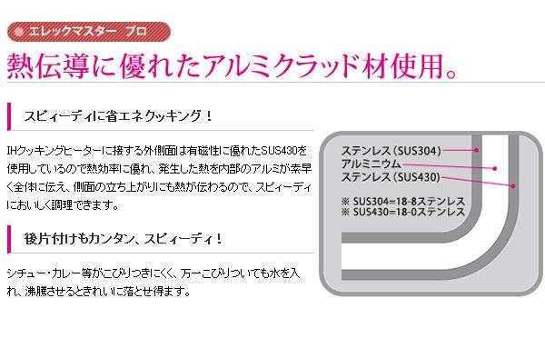 プロのアドバイスにより開発された200V IH対応。熱伝導に優れたアルミクラッド材を使用しているので、スピーディに省エネクッキングできます。