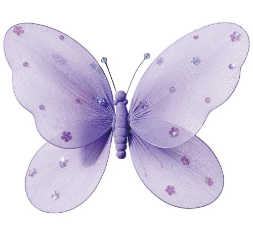 Making nylon butterflies with nylon material has been a long time tradition. At Heart To Heart, we use only the finest and most delicate nylon fabric as the material. While the nylon butterfly material is delicate, it also has to be sturdy to withstand the stretch and tear and wear. We also use non-toxic colors to dye the material. Soft wires were bended into butterfly shapes, then, nylon materials are stretched and framed the wires. It takes skill and experience to make it perfect. After the basic nylon butterflies are made, sparkling glitters are added to the trim to give a glow, flower shaped sequins are then glued sparsely throughout the body. Along with the nylon butterflies collection, we've also created dragonfly, bumble bee, ladybugs and flowers. Together, they make a beautiful garden theme. These creatures come in also different sizes and colors, they completely compliment each other in terms of shapes and sizes. Often times, our customers use them for a butterfly party , baby shower, and then, after the event, they use these items as butterfly decorations for butterfly nursery or a little girls butterfly garden room. With the nylon butterfly collection, each bugs and flowers have soft wire legs behind them, you can tie them to bed posters, use them as curtain tie back, stick them to a photo frame, or lamp shade. You can also staple them to the wall as butterfly wall decoration. Hanging a bunch of nylon butterflies, nylon dragonflies, nylon bumble bees, nylon ladybug and nylon flowers are the most commonly used application among our customers. The beautiful glitters and embellishments sparkles as these light weighted nylon butterflies, bugs and flowers sways with gentle breeze. They transform the rooms instantly into a butterfly nursery and butterfly room .