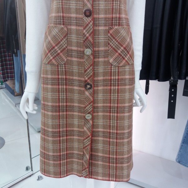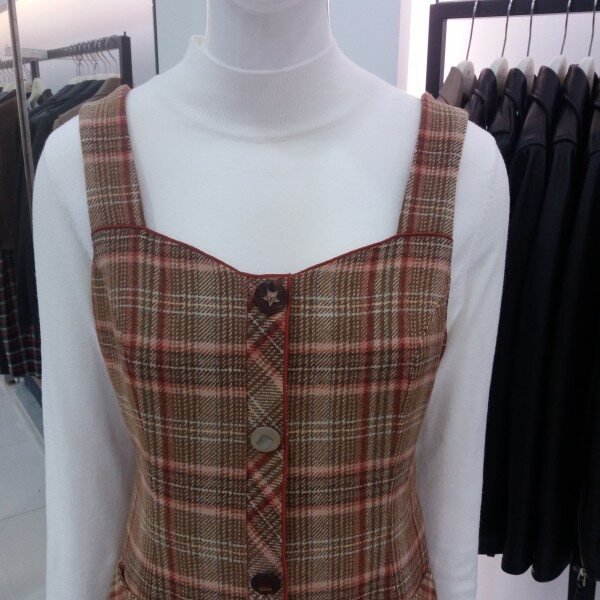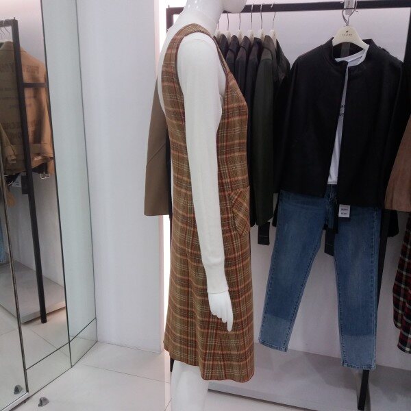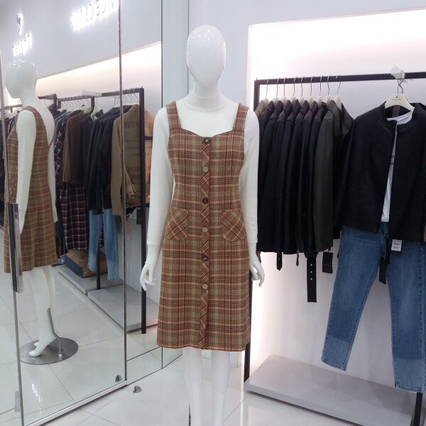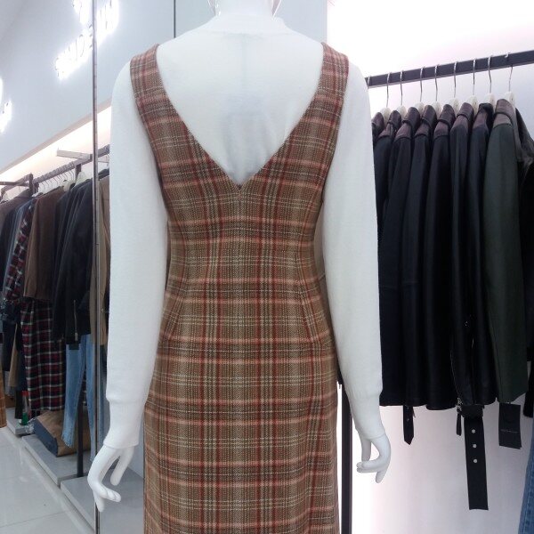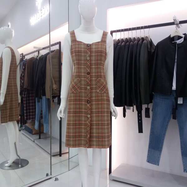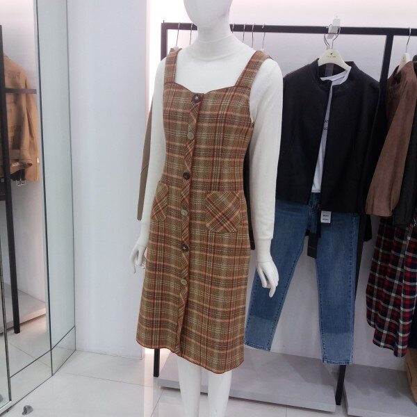 티렌 체크멜빵형원피스입니다 슬림한핏감으로 단추포인트를준 원피스입니다