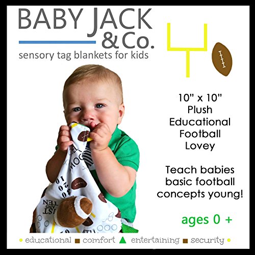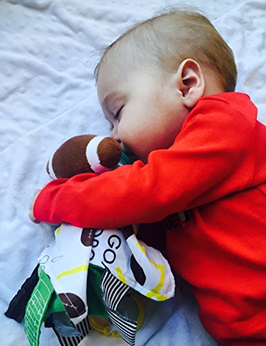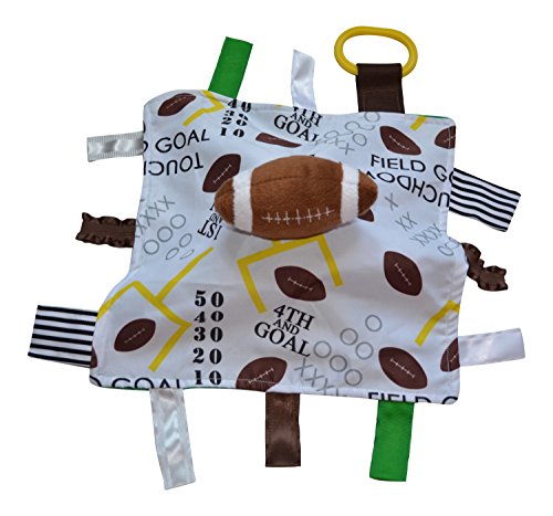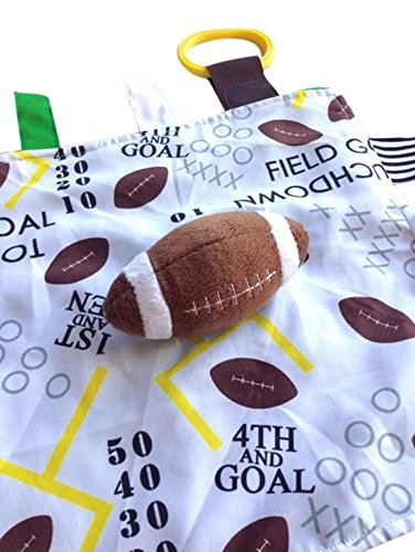 - 10" x 10" Satin Security Blanket with vibrant and modern educational print fabric with plush football sewn on.