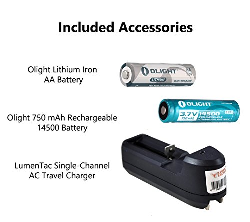 Comes with a lithium iron AA battery as well as a rechargeable 14500 battery to maximum the brightness of the light plus a LumenTac single-channel travel charger