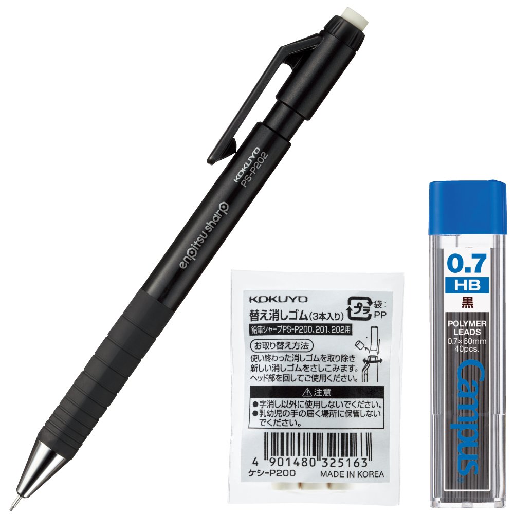 鉛筆シャープシリーズに、書き心地がさらによくなった鉛筆シャープTypeSが登場! 【カラー】 黒 ※シャープペンシル本体にあらかじめHB芯が2本入っています。 【付属】 替芯(0.7mm・HB・40本入り)、替え消しゴム(φ7mm×23mm、3本入り) 【芯径】 0.7mm 【ペン寸法(軸径×長さ)】 φ10.5mm×143mm 【材質】 軸:PC、グリップ:TPE、クリップ:ABS 【芯先】 パイプスライド