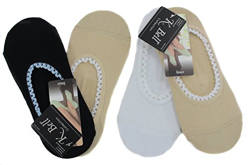 K. Bell cotton blend liner socks in a four pair value pack. These lace trimmed liner socks are a wardrobe essential You will receive four pair: one pair white, one pair in black and 2 pair in nude/beige. Perfect with flats or any time you want your feet dry and comfortable. Liners are 60% cotton,19% nylon,19% polyester.2 % spandex. Machine wash cold, gentle. Tumble dry low.Feature