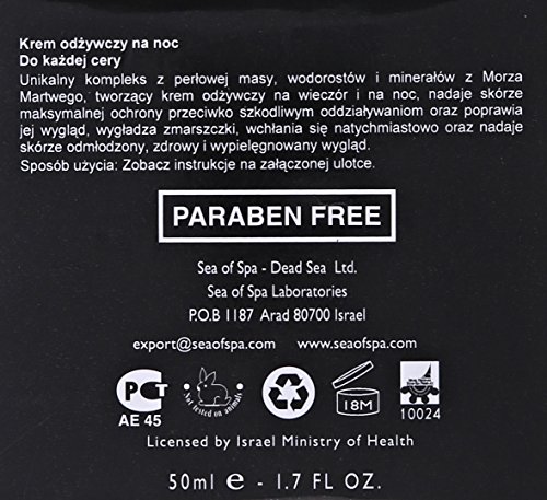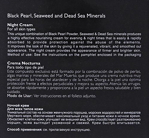 -. Binding : Misc. -. Brand : Sea of Spa -. Color : Clear -. EAN : 7290010673841 -. Feature : This unique combination of pearl powder & Dead Sea minerals produces a nourishing cream for the evening & night hours that is rapidly absorbed to provide maximum protection against any harmful effects. It improves the look of the skin by giving it a rejuvenated, healthy, & vibrant appearance as well as smoothing out wrinkles. Suitable for all skin types. -. Label : SEA OF SPA COSMETICS -. Manufacturer : SEA OF SPA COSMETICS -. Model : 7290010673841 -. MPN : 7290010673841 -. NumberOfItems : 1 -. PackageQuantity : 1 -. PartNumber : 7290010673841 -. ProductGroup : Beauty -. ProductTypeName : BEAUTY -. Publisher : SEA OF SPA COSMETICS -. Size : 1.7 oz. -. Studio : SEA OF SPA COSMETICS -. Title : Sea of Spa BLACK PEARL Age control Night cream