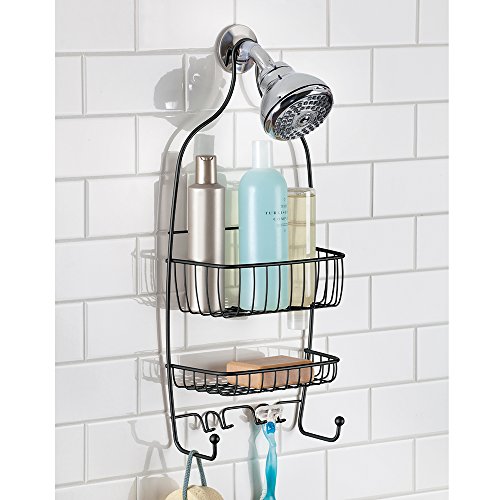 - Feature : 2 baskets accommodate large bottles of soaps and shampoos; top basket designed to hold bottles upside down / Features 8 hooks for sponges, washcloths, razors, brushes and more / Non-slip grip works with 2 suction cups to keep your caddy in place / Made of steel with rust proof satin finish / 12.5" x 4.75" x 26"