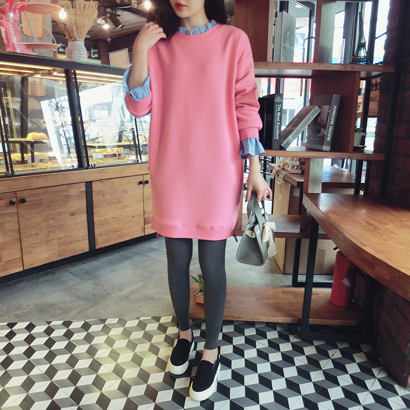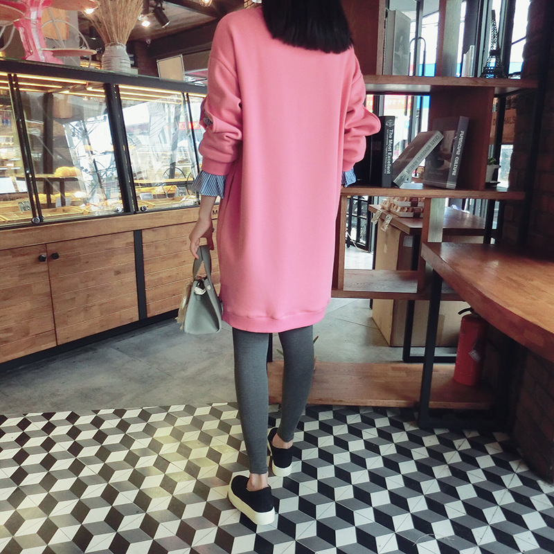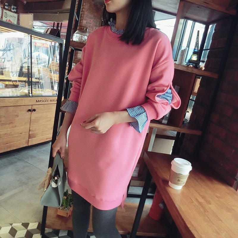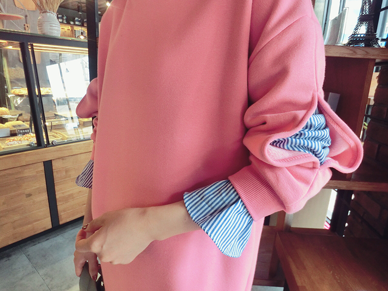 ストライプ柄のフリルブラウスをインしているみたいなトレーナーワンピース。
