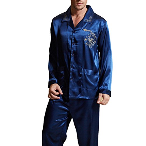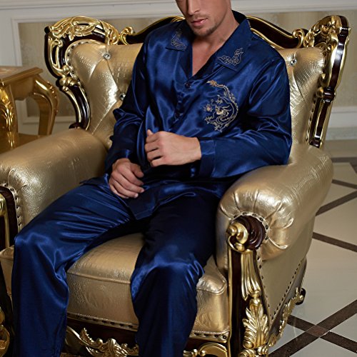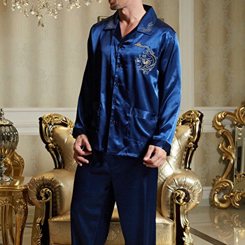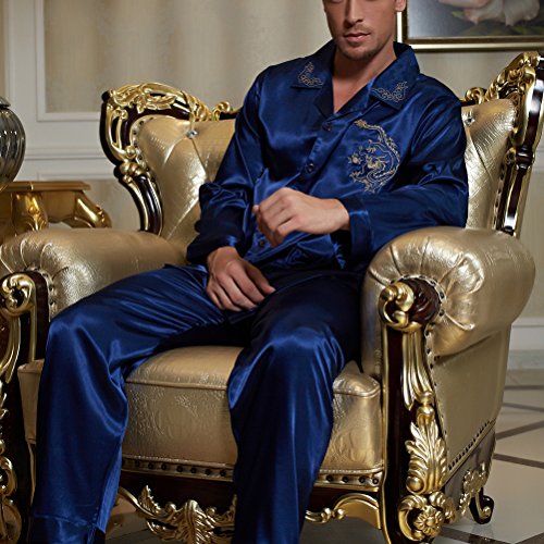 Product Description Men's classic men's pajamas set from Amybria.Pajama set features satin silk,with two waist pockets for inconvenience.The pants have a soft elastic waist that is comfortable yet secure.? Button fly front. Superior quality.
