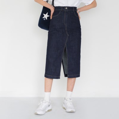 유니크한 트임 디테일이 돋보이는 데님 스커트입니다. 신축성 좋은 코튼 혼방 소재로 슬림하게 바디에 핏되면서도 활동하기에 불편하지 않아 편하게 즐겨보기 좋습니다. H라인으로 슬림하게 떨어져 날씬해 보이며 앞뒤로 깊은 트임이 있어 디자인적인 포인트는 물론 롱스커트 특유의 불편함이 없어 자주 손이 가게 될 아이템입니다. 딥한 진청 컬러 특유의 이염이 있을 수 있으니 밝은 컬러의 아이템과 매치시 주의해주시길 바랍니다.
