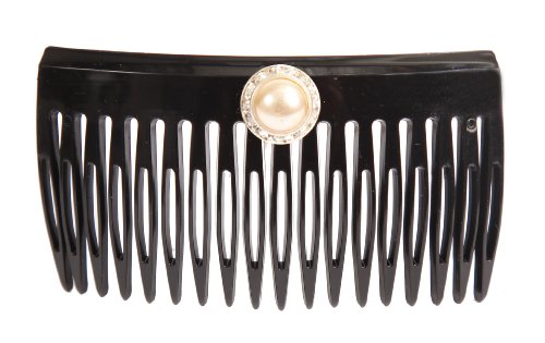 Caravan Hand Decorated French Comb with Large Pearl and Swarovski Crystal Stones Silver Setting, Black, .65 Ounce