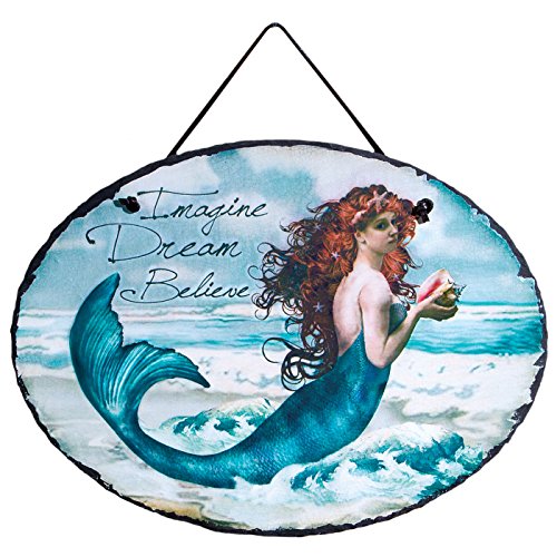 - Slate wall piece hangs from a leather cord knotted to the slate