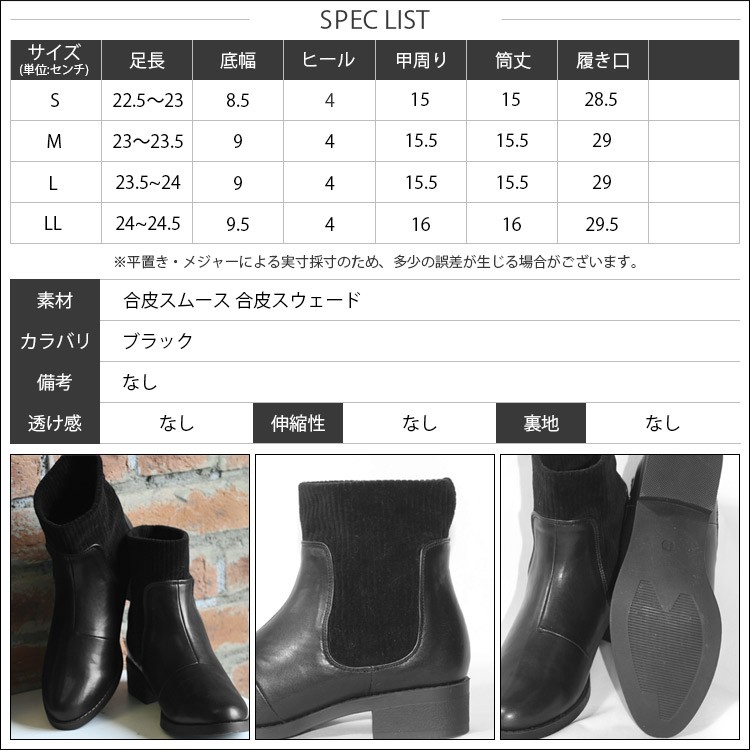L :足長 23.5-24.0cm 底幅 9.0cm ヒール 4.0cm 甲周り 15.5cm 筒丈 15.5cm 履き口 29.0cm