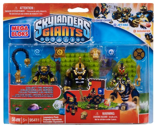 -. Binding : Toy -. Brand : Mega Bloks -. EAN : 4516790054124 -. Feature : Buildable Legendary Jet-Vac (Air character) with energy shooter / Buildable Legendary Chop-Chop (Undead character) with sword and shield / Buildable Legendary Bouncer (Tech giant) with speed-cloud stand accessory / Loot, legendary-inspired pieces and golden sheep included / Combine with 3 base plates to other Mega Bloks Skylanders Giants sets and build your adventure! -. IsAdultProduct : 0 -. Label : Mega Brands America - Megabloks -. Manufacturer : Mega Brands America - Megabloks -. Model : CXM31 -. MPN : 95411 -. PackageQuantity : 1 -. PartNumber : 95411 -. ProductGroup : Toy -. ProductTypeName : TOYS_AND_GAMES -. Publisher : Mega Brands America - Megabloks -. Studio : Mega Brands America - Megabloks -. Title : Mega Bloks Skylanders Legendary Pack -. UPC : 065541954113 -. Warranty : Lifetime warranty against manufacturer's defects