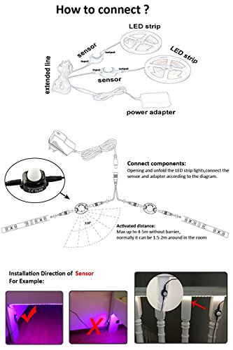 - Dual Sensor Design --- 2pcs x PIR sensor with 2pcs x 1.5m strip light. Motion and Light sensor workable,the inductive range is 120°,Most important,this kit is adopting UL listed power adapter(US Plug).