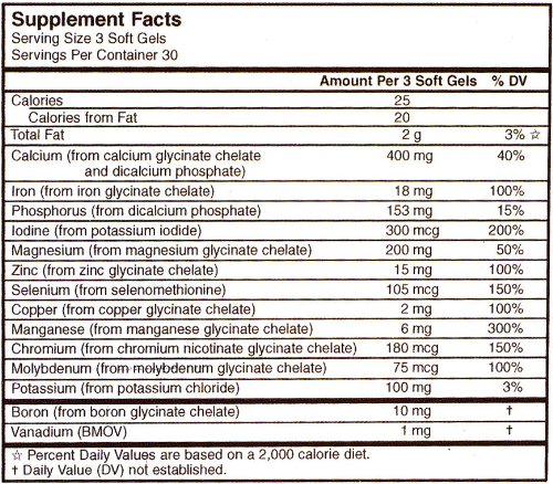 -. Feature : Contains 100% RDA of iron glycinate chelate per serving / Formulated in a neutral sunflower oil base and without common allergens / Natural colors no preservatives no wheat no yeast no dairy gluten free minerals