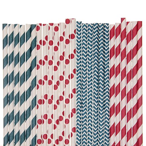 -. Title : Red, White and Navy Blue Straw Mix - Chevron, Striped, Polka Dots