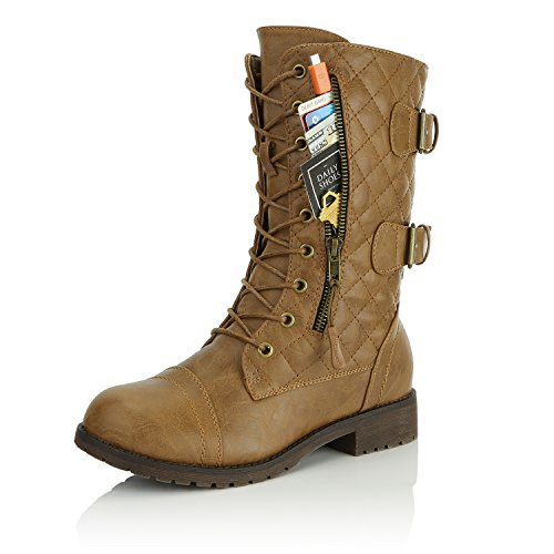 -. Title : DailyShoes Women's Military Lace Up Buckle Combat Boots Mid Knee High Exclusive Quilted Credit Card Pocket