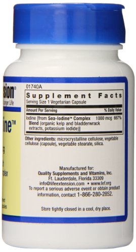 -. Binding : Health and Beauty -. Brand : Life Extension -. EAN : 0737870174066 -. Feature : Sea-Iodine is a low-cost proprietary formula that health-conscious individuals can take each day to support optimal iodine levels. / Harvested from a blend of organic marine algae / Brings you the health of the sea while avoiding the dangers of excessive salt intake. The algae found in Sea-Iodine provide you with over 667% of the Recommended Daily Value of natural iodine. / Primary biological role lies in the production of the thyroid hormones triiodothyronine (T3) and thyroxine (T4) -. IsAdultProduct : 0 -. Label : Life Extension -. LegalDisclaimer : This information is intended for your general knowledge only and is not substitute for professional medical advice or treatment for specific medical conditions. This information is not intended to diagnose, treat, cure or prevent any disease. Always seek the advice of your qualified physician or other health care provider with any questions you may have regarding a medical condition. Keep out of reach of children. -. Manufacturer : Life Extension -. MPN : 01740 -. NumberOfItems : 1 -. PackageQuantity : 1 -. PartNumber : 01740 -. ProductGroup : Health and Beauty -. ProductTypeName : HEALTH_PERSONAL_CARE -. PublicationDate : 2014-03-04 -. Publisher : Life Extension -. ReleaseDate : 2015-03-19 -. Size : 60 -. Studio : Life Extension -. Title : Life Extension Sea-Iodine Capsules, 1000 mcg, 60 Count -. UPC : 737870174066