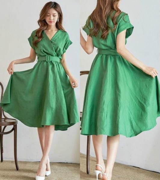 ☆ウエストゴム+ベルト付き☆Vネック ミモレ丈 フレアワンピース