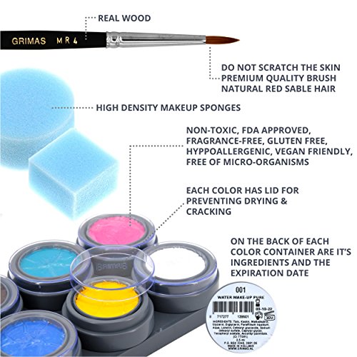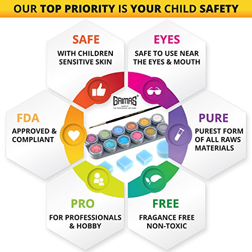 ✅SATISFACTION GUARANTEE - Grimas Metallic Face Painting Kit is FDA compliant and has passed the most strictly EU regulations and you can rest assured that this Professional Metallic Face Paint makeup is free from hazardous substances and complies with the applicable health and safety standards in the United States. In the unlikely case that your face paint palette is not perfect for you, just send the body paint kit back for a full refund!