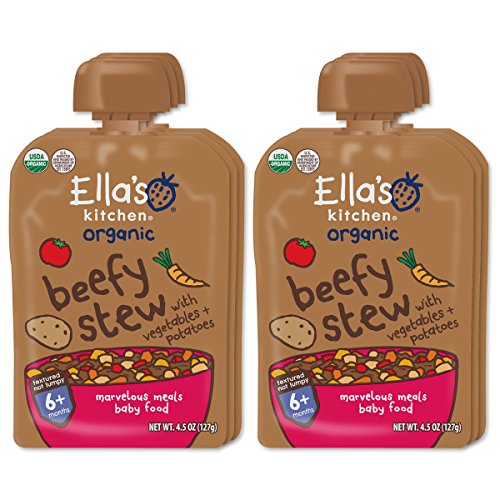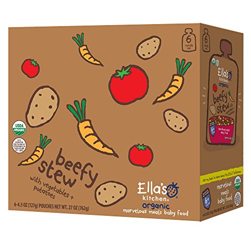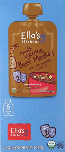 -. Feature : Six 4.5 oz. pouches of Ella's Kitchen 6+ Months Organic Beef Medley with Vegetables + Potatoes Baby Food / Made with beef, potatoes and veggies / No artificial preservatives, additives or thickeners / For babies 6 months and older / USDA-Certified Organic / For babies 6 months and older