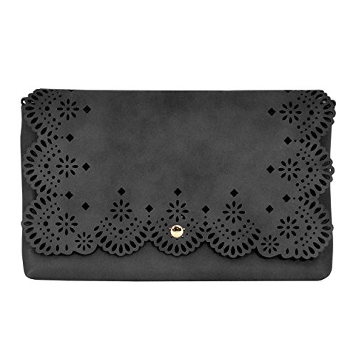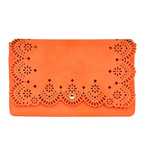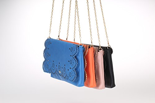 Product Description This Sophisticated Stenciled Clutch make you look fabulous, while holding all of your essential items for the evening ahead of you. It is made of beautiful, faux leather and had a sophisticated, stenciled cut out design. It is sure to go with your evening wear perfectly, and then some. Attach the chain strap when a shoulder bag is preferred. With a roomy interior to fit many essential items, this clutch is sure to have your back during your evening out. The interior of the clutch is roomy and has a separated zippered pocket. Clutch opens and closes two ways, first by zipper and second by a magnet snap, so you can be sure your items are safe. Sophisticated Stenciled Clutch available in: black with gold toned chain and hardware, white with nickel toned chain and hardware, toasted almond with gold toned chain and hardware, strawberry ice with gold chain toned hardware, and classic blue with gold toned chain and hardware, and tangerine with gold toned chain and hardware. Measures: 11" x 7"x 1" Strap Drop:24" 0