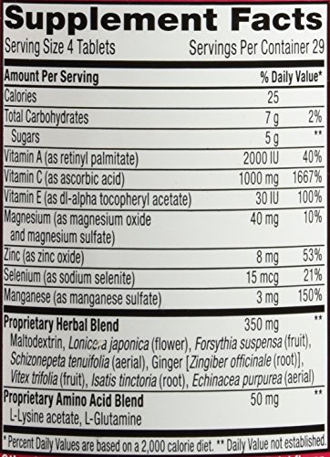 -. Feature : New Airborne® Chewables are your immune system's cheerleaders. Your immune system's got a big job to do and supporting it just got more convenient thanks to Airborne® Chewable tablets. We've included our powerful formula of 14 vitamins, minerals and herbs, including Zinc, Echinacea and a blast of Vitamin C into easy-to-chew tablets. Water not required. So give me a C! Give me an H! Give me an E-alright. You get the picture! / 4 Chewable Tablets equal: 1,000 mg of Vitamin C High in Antioxidants (Vitamins A,C, and E) Excellent Source of Zinc and Selenium 350 mg of Herbal Blend including Echinacea and Ginge