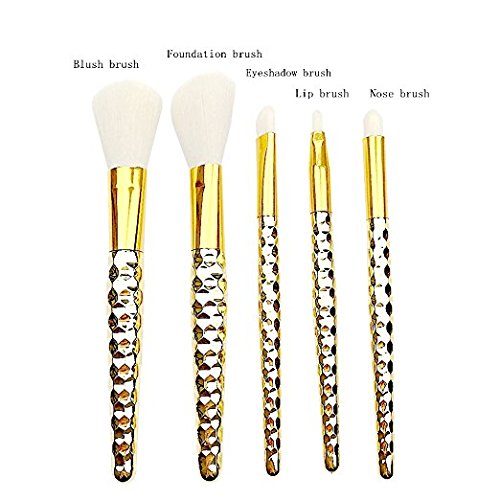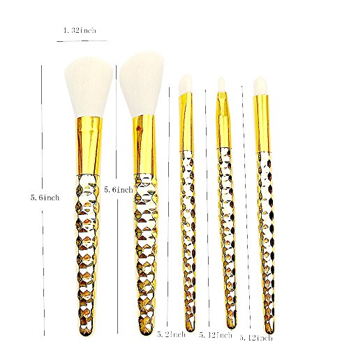 - New Style Makeup Brush:5pieces Honeycomb Style Makeup Brush,Including Foundation brush(5.6inch)+Blush brush(5.6inch)+Lip brush(5.12inch)+Nose brush(5.12inch)+Eyeshadow brush(5.2inch),Package is Flannelette bag,Material is Aluminum tube and ABS,bristles are mainly fiber wool,The touch is very soft and Brush grasp powder is fine.Weight is 60g/set.If you are a boy,it is is the best gift for your girl friend.
