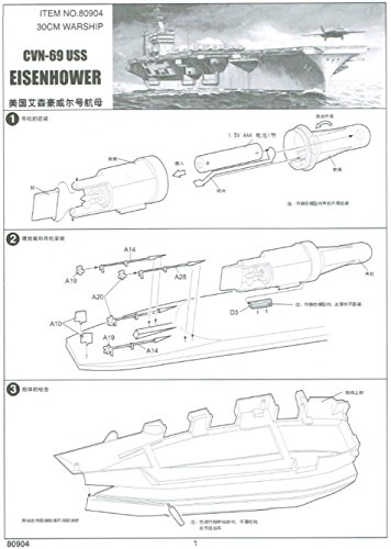 アメリカ海軍 原子力空母 CVN-69 ドワイト・D・アイゼンハワー 満載排水量 101,635トン ニミッツ級航空母艦の2番艦のプラモデルとなります。 中国国内向け製品のため、組立図は中国語表記となります。フルハルディスプレイモデルとしても楽しめます。 初級者入門用・中級者のアレンジ用にご利用下さい。 日本製ウォーターラインシリーズ並みのリアリティはありません。 旧ニチモ 30cmシリーズ以上の部品点数とリアリティはあります。Feature