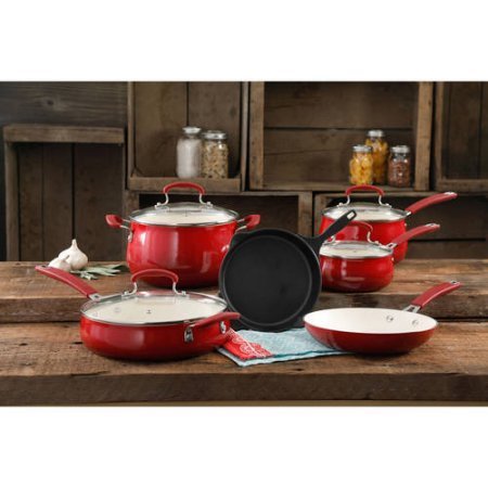 -. Title : The Pioneer Woman Classic Belly 10-Piece Cookware Set, RED