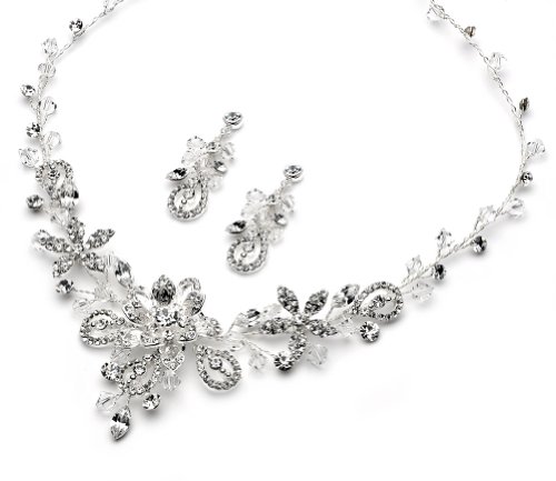 This Swarovski Necklace & Earring set is perfect for any bride! This stunning wedding jewelry set is hand wired with Genuine Swarovski Crystals and brilliant rhinestones in a beautiful scrolling and floral pattern. The set is both delicate, yet with so much sparkle! The necklace measures 14 to 18 inches with the attached extender chain. The center drop measures 2 inches in total length. The earrings measure 1.5 inches in length. The stunning crystal wedding jewelry set coordinates with any color wedding dress or formal ensemble.Feature