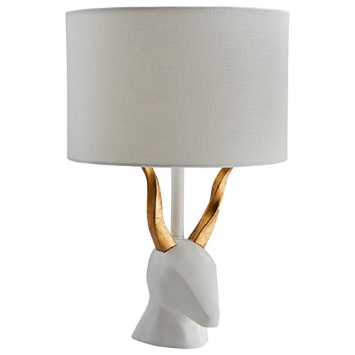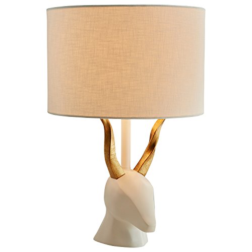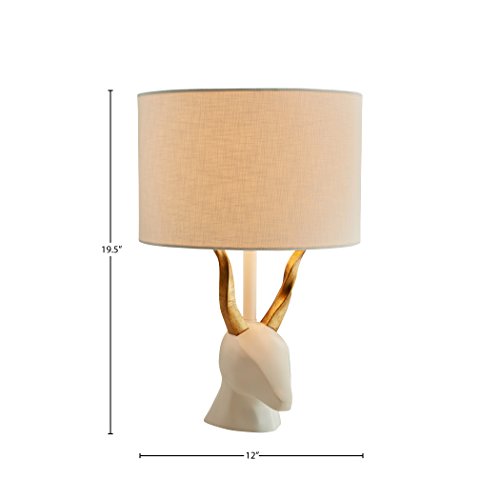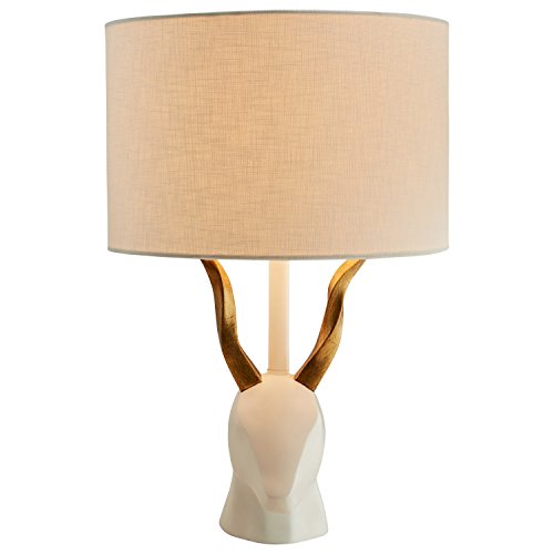 Whether you're a nature enthusiast or simply want a stylish conversation piece, this deer head lamp is sure to turn heads in your living area or bedroom. The white ceramic base is topped with painted ceramic horns and a textured round drum shade.