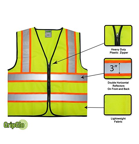 GripGlo Reflective Safety Vest, Bright Neon Color with 2 Inch Reflective Strips - Orange Trim - Zipper Front, Large