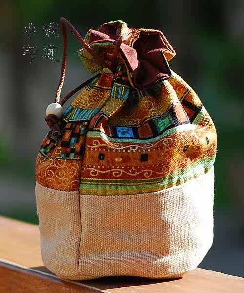 Material: Burlap, wood beads, thread, belongs to a small handbag