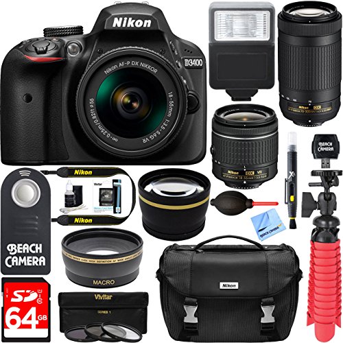 Nikon D3400 24.2 MP DSLR Camera + AF-P DX 18-55mm & 70-300mm NIKKOR Zoom Lens Kit + 64GB Memory Bundle + Nikon Photo Bag + Wide Angle Lens + 2x Telephoto Lens + Flash + Remote +Tripod+Filters (Black)