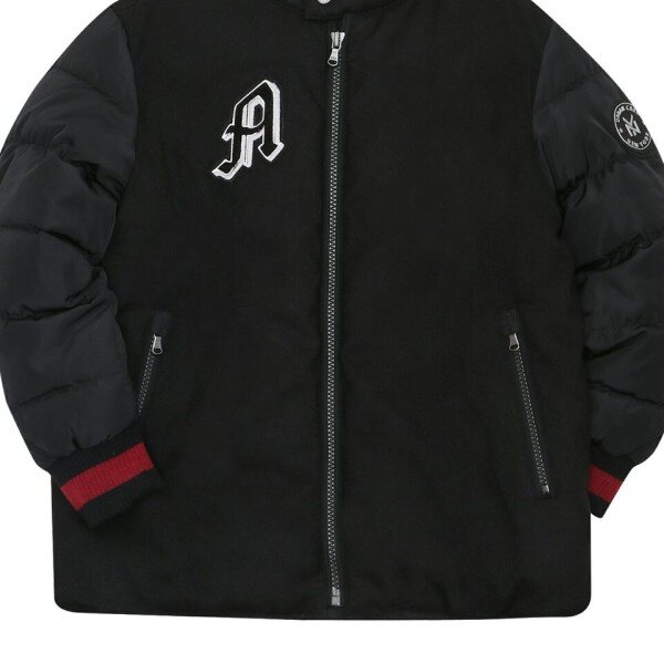 기모느낌의 몸판원단과 소매 화섬원단으로 배색을 준 웰론 야구점퍼.초겨울 입기 시작하는 캐쥬얼 유니 아이템가슴 부클 자수와 배색 시보리로 포인트