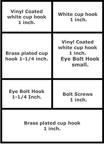 - Set contains: vinyl coated cup hook, brass plated cup hook, white cup hook, zinc coating eye bolt hook and bolt screws.