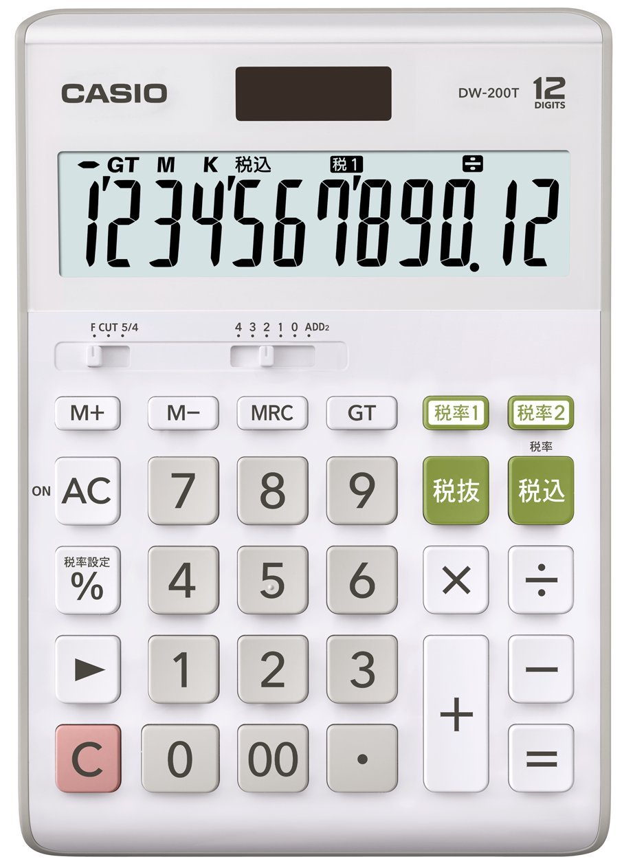 ●桁数: 10 ●メモリー:2 ●電源種類:T・W・P(太陽電池と補助電池の併用)(CR2032) ●電池数:1 ●電池寿命:約7年 ●大きさ(奥行×幅×高さ mm):179.5×126.5×32.6 ●質量(g):170 機能:税率2通り設定,税計算,計算状態表示,マルチ%,四則定数計算,概数計算,桁下げ,(シフト),小数の端数処理(四捨五入/切り捨て),小数点セレクター,キーロールオーバー機能(早打ち機能),ツーゼロキー