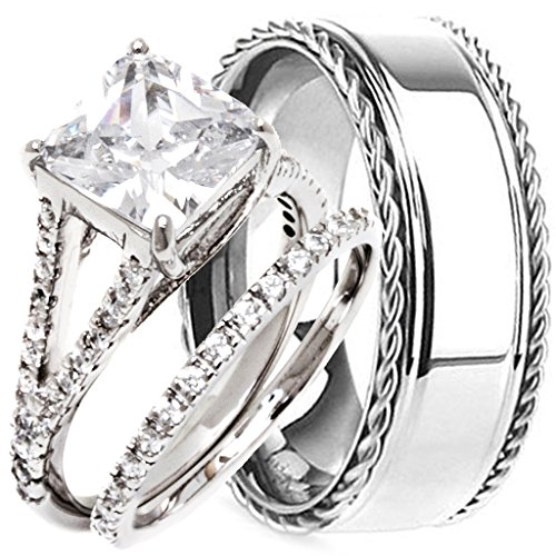 -. Title : 3 Pieces Men's and Women's, His & Hers, 925 Genuine Solid Sterling Silver 7MM & Titanium with Chain Edges Engagement Matching Wedding Anniversary Ring Set