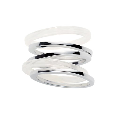 -. Feature : シルバー925(ロジウムメッキ)・セルロースアセテート / 5本セット着用時 幅約 8.0mm シルバーリング:幅約 1.3mm 樹脂リング:幅約 2.0mm / S:高さ約2.1cm 樹脂リング高さ約2.15cm 着用感:約#11 / M:高さ約2.2cm 樹脂リング高さ約2.3cm 着用感:約#13 / 歪んだ楕円のフォルムは織部の茶碗へのオマージュ。 「織部の茶室」がデザインソースの人気シリーズ「Oribe」に夏らしく涼やかな新素材が登場。 乳白色のリボンが折り重なったような半透明の樹脂と、クリーンなツヤを持つシルバーとの組み合わせがスタイリッシュな雰囲気を与えてくれます。ゆがんだフォルムを重ねることで常に新しい表情が生まれる5本セットのリングは、すべてを1つの指に着けても、ばらばらに着けても。重ねる本数や素材の組み合わせをデザインすることで、毎日身につけても飽きのこない新鮮な変化を楽しめます。