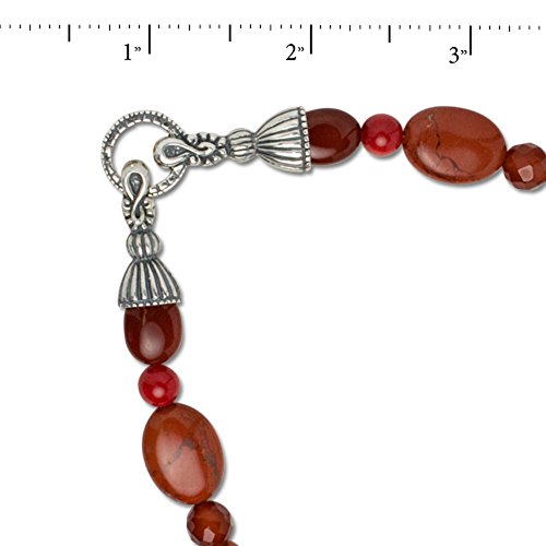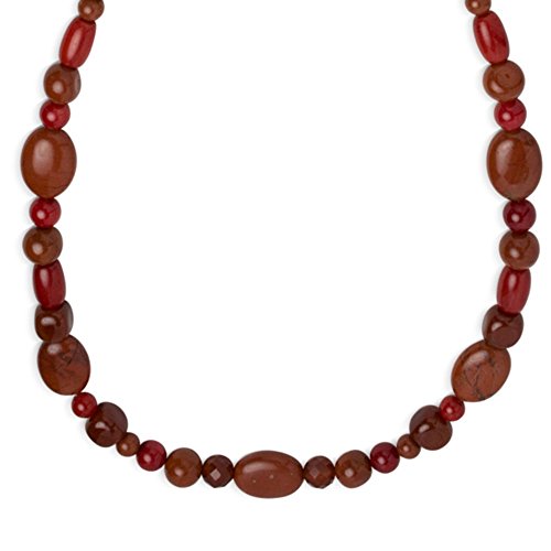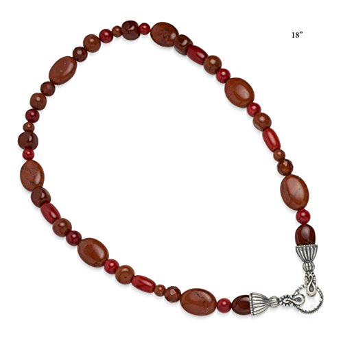 Radiant red adds fiery flair to your fashion statement! This bold red necklace features a spectrum of warm, bright hues of red natural gemstones of red coral, reddish-brown carnelian and red jasper. The last bead on each end has a genuine .925 sterling silver cap leading to the unique ring and snap closure to which the matching bracelet (B0026KD81K, sold separately) can be added to extend the length of the necklace to 26 inches L. *Note: Color may vary due to characteristics of the natural stone. Our jewelry features gemstones from around the world. Many natural gemstones undergo treatment as part of the finishing process to enhance the beauty or durability of the stone. Stone treatment is an accepted industry practice if done ethically and with full disclosure. When any natural, treated stone is featured in a piece of our jewelry, the treatment method is listed in the Product Specifications area. Please see our Detailed Seller Information for more information. Our jewelry is proudly made in America with US and imported parts. We do our part for the environment by crafting our jewelry from recycled .925 sterling silver.Feature