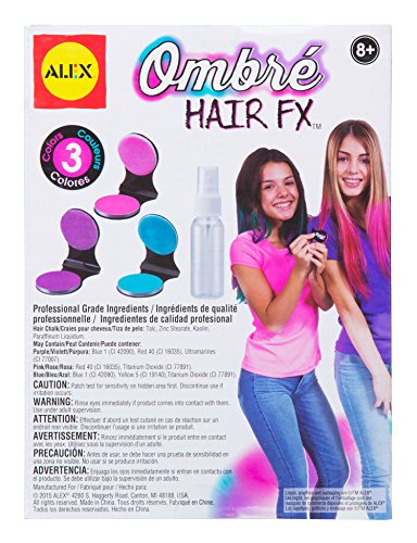 ALEX Toys Spa Ombré Hair FX lets you blend and layer color into your hair for a trendy look. Add pink, purple and teal to your flowing locks for a style that will surely stand out. The colors wash out so you could be sporting a design every day. The kit includes 3 hair chalk applications (0.1 oz.), spray bottle and easy instructions. Recommended for children 8 years of age and older.Feature