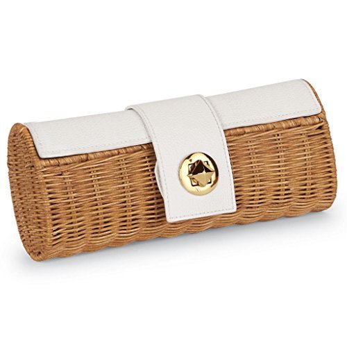 This rattan clutch by Mud Pie is the perfect accessory to add a touch of natural beauty and sheer elegance to your outfit. It has a faux leather top and foldover flap, making a beautiful contrast against the straw material of clutch. The flap is studded with a gold-tone turn lock clasp which is shaped like a raised pyramid resting on round base, shining in all its golden color glory. With all that said, this straw clutch will truly jazz up any outfit.Feature