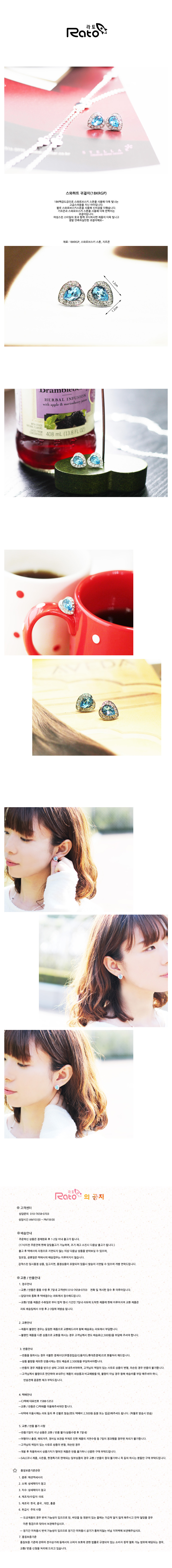 - 취급시 주의사항도금제품의 경우 변색 가능성이 있으므로 땀, 바닷물 등 염분이 있는 물에는 가급적 닿지 않게 해주시고 만약 닿았을 경우 마른 헝겁으로 닦아서 보관해주십시오
