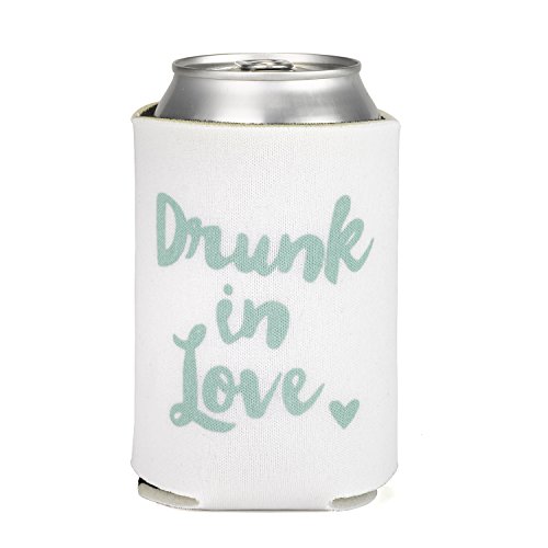 - White cloth beverage cooler with the words "Drunk in Love" printed in aqua blue on one side