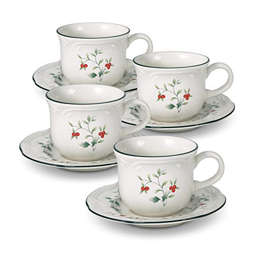 -. Feature : Classic holiday Winterberry pattern / Set of 4 includes (4) 8 ounce cups and (4) 5-3/4 inch saucers. / Made of high quality stoneware / Styling allows for display as well as functional use / Dishwasher and microwave safe
