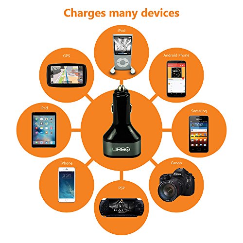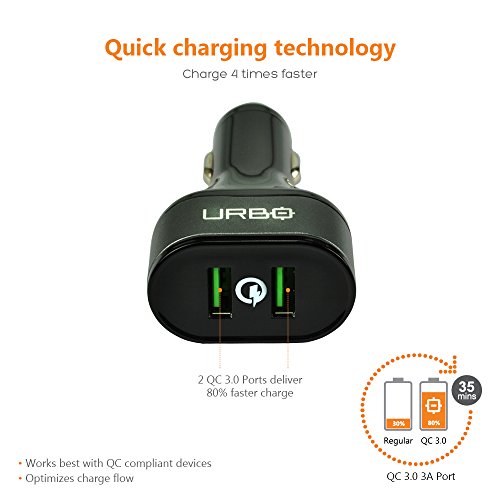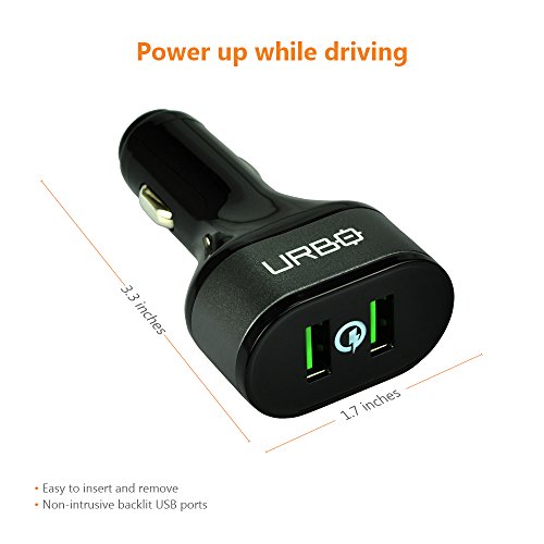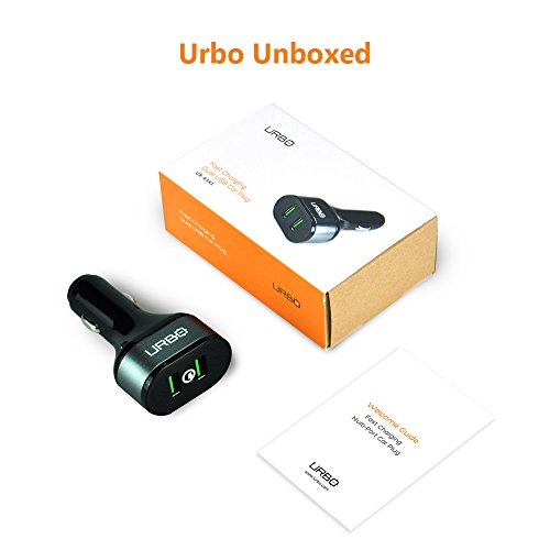 Studio : Urbo Publisher : Urbo Binding : Wireless Phone Accessory Product Description Share power with two devices or two people - no need to jostle for space or time. Quick charging technology Quick charging port powers up compatible devices upto 80% in just 35 minutes so that even a short drive is enough for a good charge. Compatibility The Urbo® car plug works with devices that are compatible with quick charging technology and it also with phones, GPS devices, iPod, digital camera, music players and other USB devices. Charges Asus ZenFone 3 Deluxe, BlackBerry KEYone, HTC U11, LG G5 / G6, Nokia 8, Philips EverPlay, Xiaomi Mi 6, ZTE Blade Z Max and other USB devices too. Safety Protects against overload, excess voltage, excess current and short circuit. It gives constant voltage and constant current. Protects against overheating but the device may get warm with long-term operation under certain weather conditions. Durable shell looks good, is safe and sturdy too. Specifications Dimensions: 3.3" x 1.7" x 1" (84 mm x 44 mm x 26 mm) Weight: 1.4 oz (40 gms) Input Voltage: DC 12 ~ 24 V Output Voltage and Current: 3.6 ~ 6.5 V / 3 A, 6.5 ~ 9 V / 2 A, 9 ~ 12 V / 1.5 A Rated Power: 36 W USB Output: Common Charging Total:- 4.8 A QC 3.0 Charging Total: 6 A Warranty Rest easy with Urbo's 1-year International Warranty (Extended Warranty available for registered members). 0