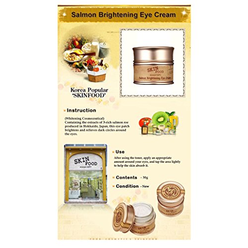 -. Feature : Skin Food Salmon Brightening Eye Cream / 1.06 Oz/30g / Contains arbutin n the extracts of Omega 3-rich salmon roe produced in Hokkaido Japan / Salmon oil recovers eye rim n make it bright effectively / Brightens n relieves dark circles around the eyes